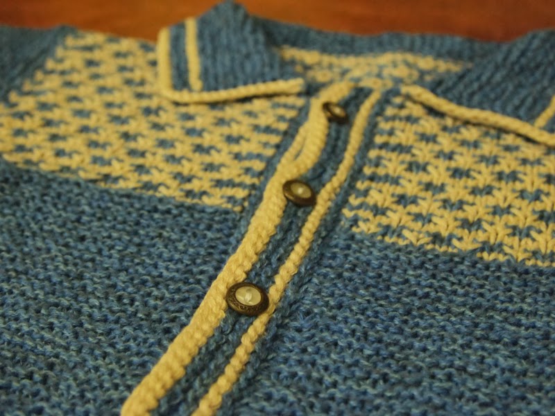 First up is the little blue cardigan I showed you previously as I was working out the patterned yoke.